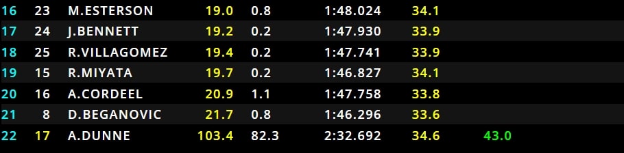 14:36 – Non ci sono per il momento delle penalità per quanto riguarda il precedente contatto tra Minì e Dunne.