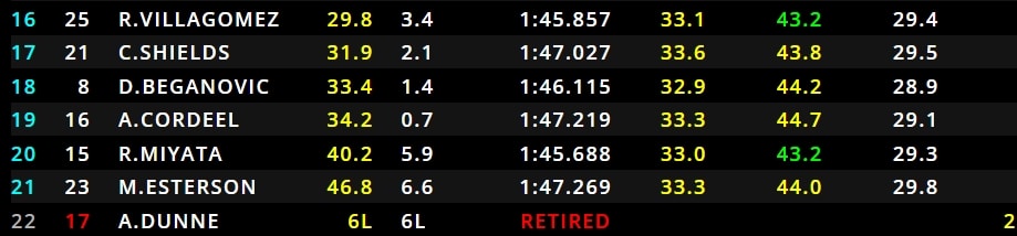 14:32 – Si è staccata la gomma dalla monoposto di Dunne, che procede lentamente lungo la pista. Minì accusa un danno all’ala anteriore ma resta in 12esima posizione.