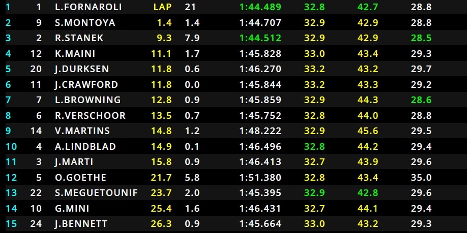 14:22 – Leonardo Fornaroli conserva un gap su Maini al limite del secondo. Il giro veloce della corsa è stato fatto registrare per il momento da Montoya.