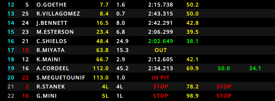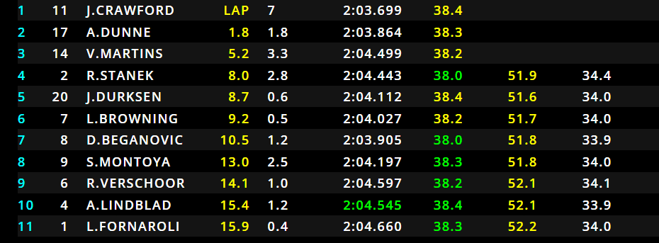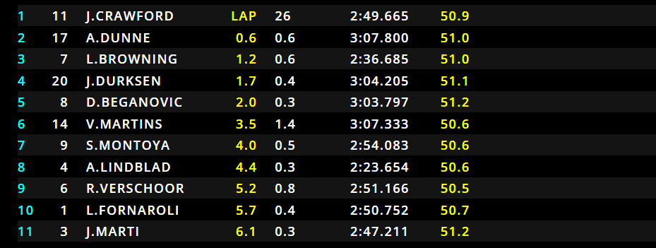 26/29 – Si fermano Dunne, Martins, Durksen e Beganovic. Jak Crawford mantiene la prima posizione, con Dunne che ha perso moltissimo tempo dietro a Cordeel, e rischia anche di perdere la posizione su Browning. Vediamo la classifica dopo che tutti i piloti hanno effettuato il pit-stop: