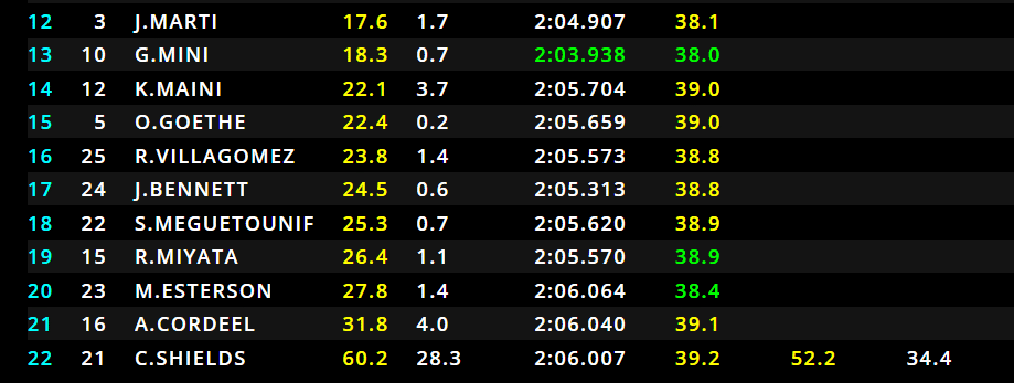 6/29 – Ci riprova Fornaroli, stavolta cercando un incrocio alla Stowe. Si difende però ancora Lindblad, che non molla la decima posizione. Intanto, prosegue la sua rimonta Minì, che ha scavalcato Maini, e si trova nello stesso trenino di Fornaroli, che comprende anche Pepe Martì in dodicesima posizione.