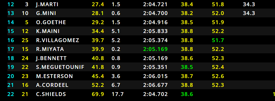 13/29 – Montoya prova l’attacco su Stanek alla chicane Vale, ma il pilota ceco incrocia alla perfezione. Intanto, Browning guadagna quasi un secondo su Martins, ora il gap tra i due è 2.4 secondi.
