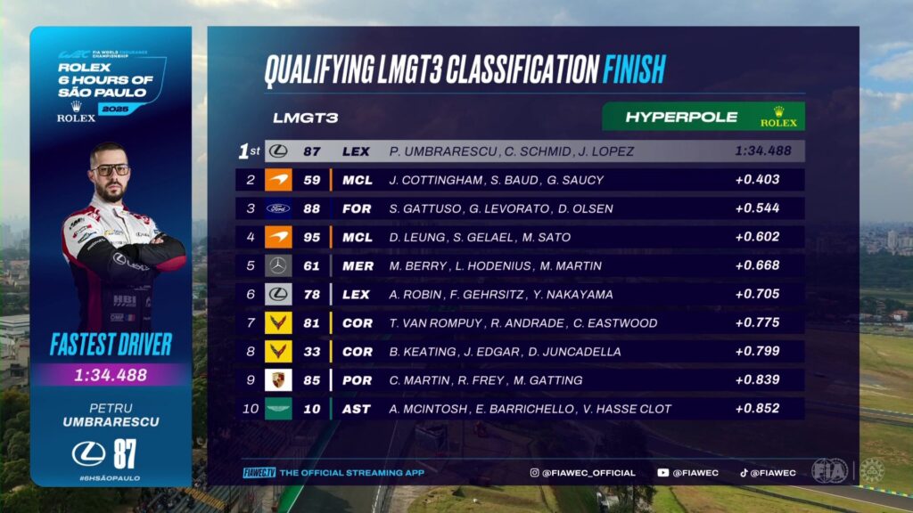 Qualifiche 6h di San Paolo 2025: la CRONACA dell’Hyperpole LMGT3