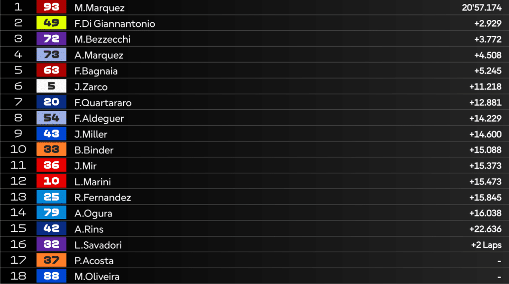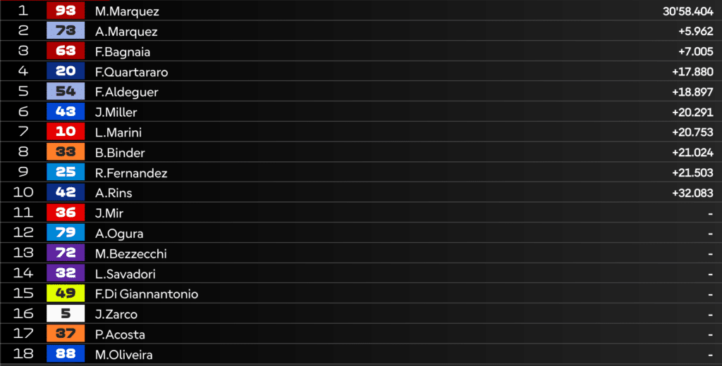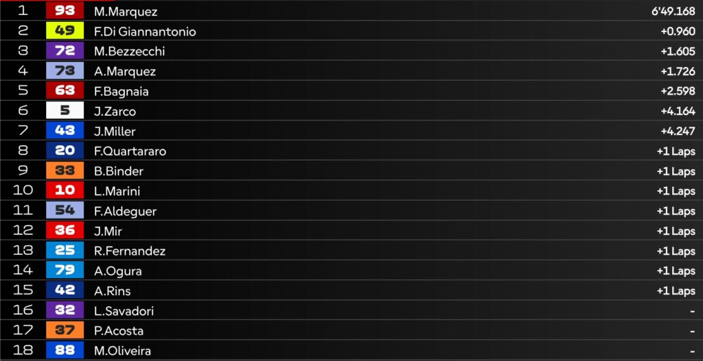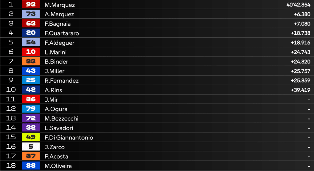 14:43 – VINCE MARC MARQUEZ! Sul podio anche Alex e Bagnaia, chiudono in 10 la gara.