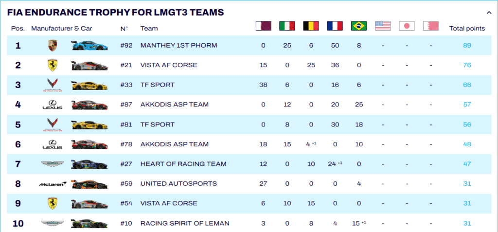 Le classifiche WEC dopo San Paolo 2025: la top 10 in classe LMGT3