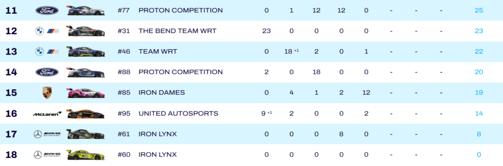 Più contenuto ma comunque rilevante il progresso della Porsche #85 delle Iron Dames, che con i 12 punti della quarta posizione scala una posizione in classifica. Ora ha nel mirino un gruppetto compatto: la Ford #88 (a 20 punti), la BMW #46 (22), la BMW #31 (23) e la Ford #77 (25). Un distacco tutto sommato colmabile nelle prossime gare.