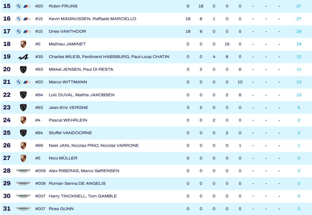 Dietro alla #7, staccato di 4 punti troviamo Matt Campbell, il pilota Porsche che ha corso in diverse occasioni, ma non a San Paolo non essendo pilota full time. Dietro Campbell, a 38 punti, l’altro equipaggio Cadillac, composto da Jenson Button, Earl Bamber e Sébastien Bourdais.