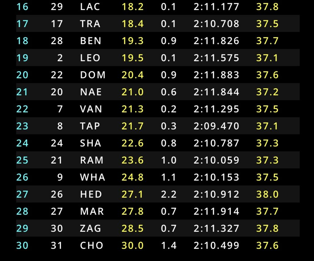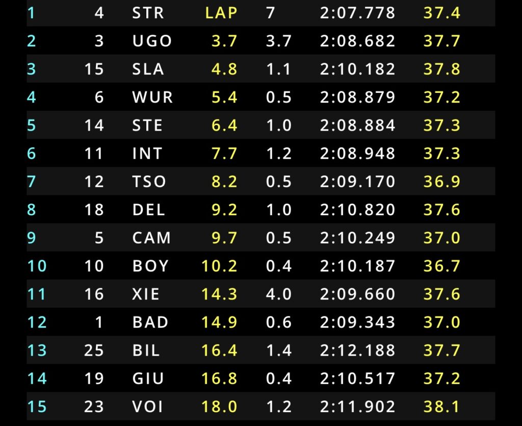 7/12 – Stromsted allunga a quasi tre secondi di vantaggio su Slater, che subisce l’attacco di Ugochukwu. Dietro, lottano Inthraphuvasak e Del Pino, con il giovane pilota spagnolo che perde anche la posizione su Tsolov.