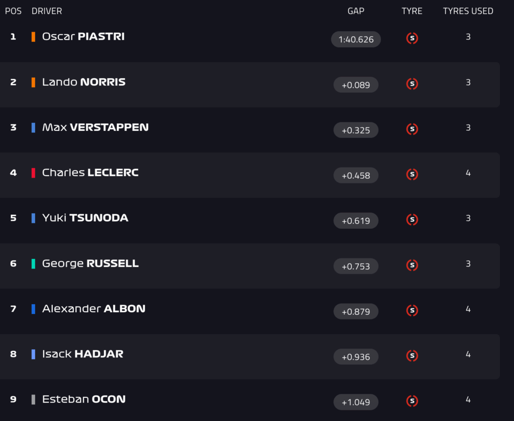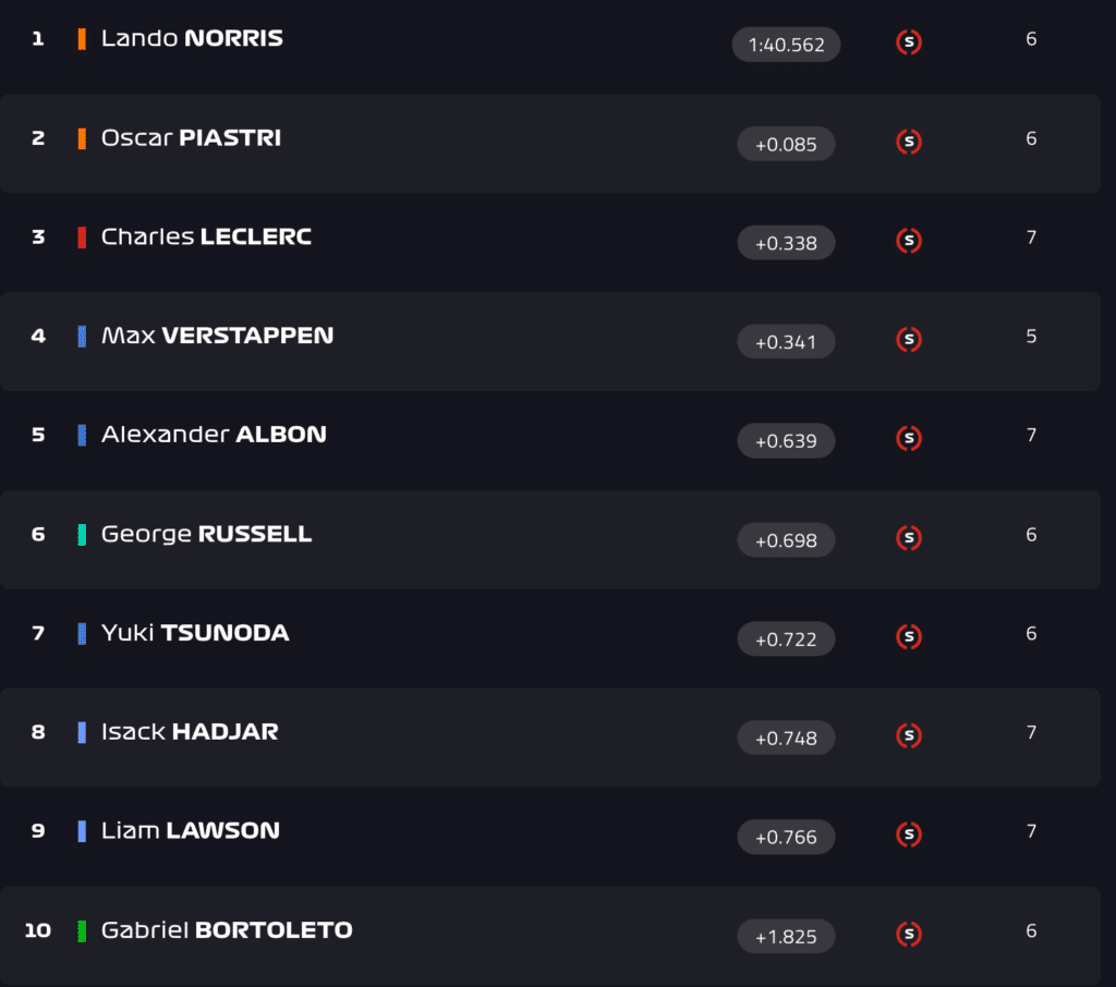 16:53 – NORRIS! NORRIS! Suo il miglior tempo! Seguono Piastri, Verstappe e Leclerc.
