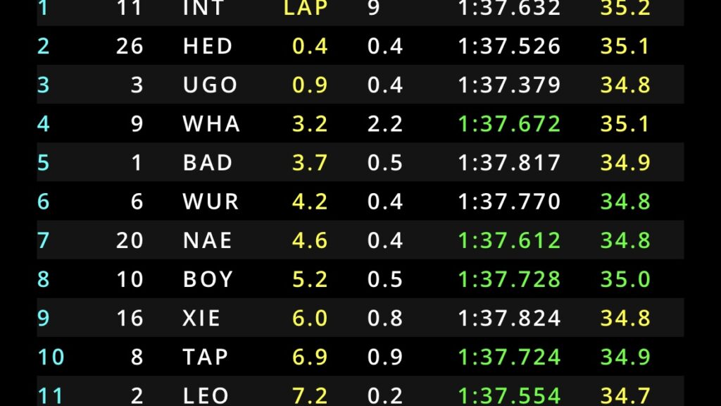 11/19 – Grande sorpasso di Ugochukwu in curva 4 su Hedley: seconda posizione per il pilota americano, che va ora a caccia di Inthraphuvasak per la prima vittoria in Formula 3. Nel frattempo, Leon passa Xie e Camara passa Taponen per l’undicesima posizione.