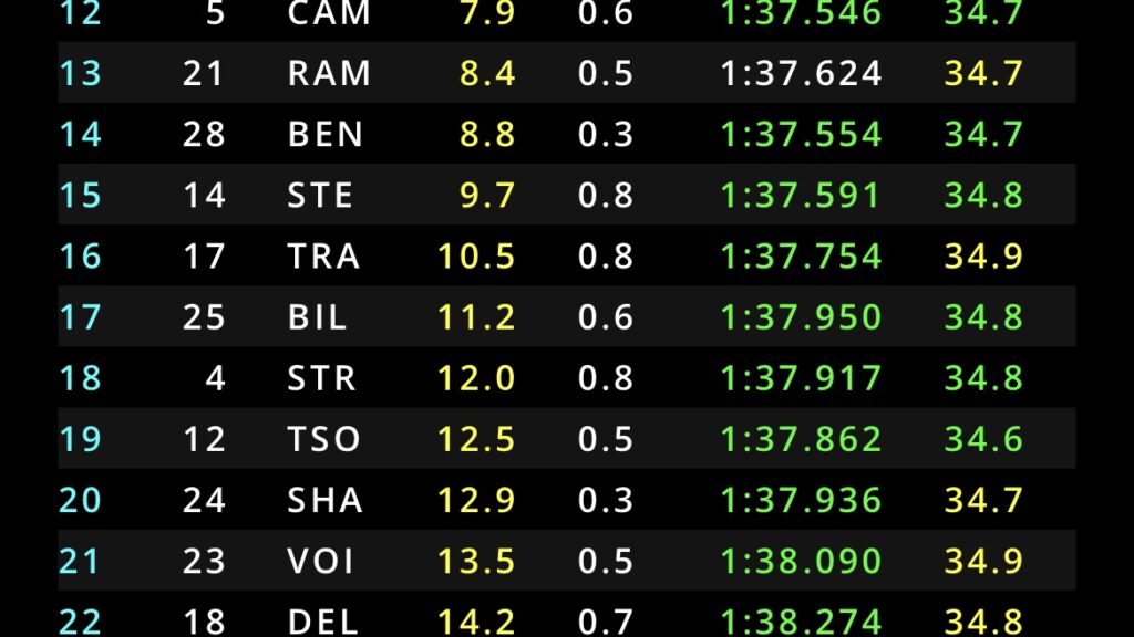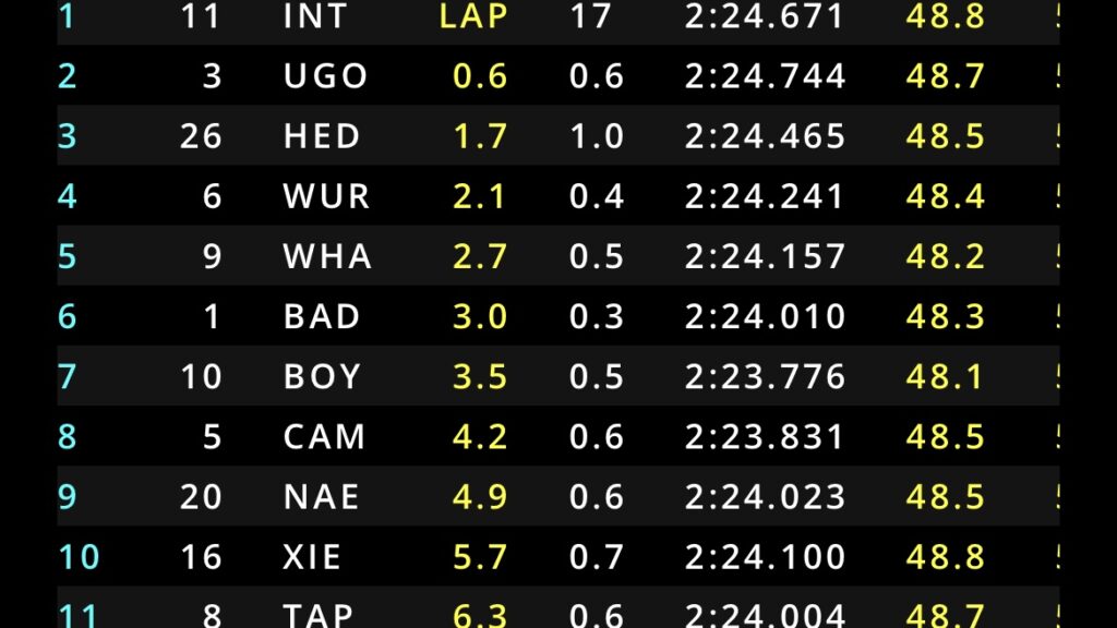 7/19 – In difficoltà Wharton, che si stacca da Hedley e subisce l’attacco di Ugochukwu in curva 1. Intanto, Camara si lamenta di un taglio di chicane di Benavides, che non gli ha restituito la posizione. Possibile penalità per il pilota del team AIX Racing.