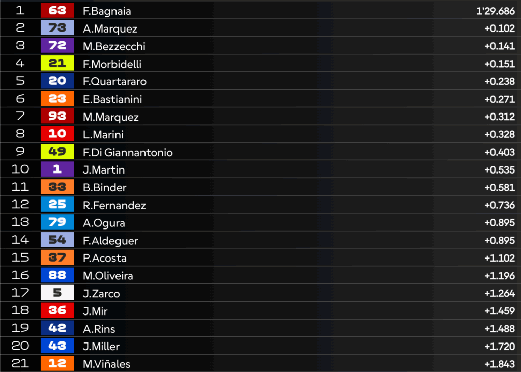 11:03 – Pecco Bagnaia ora in testa a 27 minuti dal termine: ecco i primi risultati.