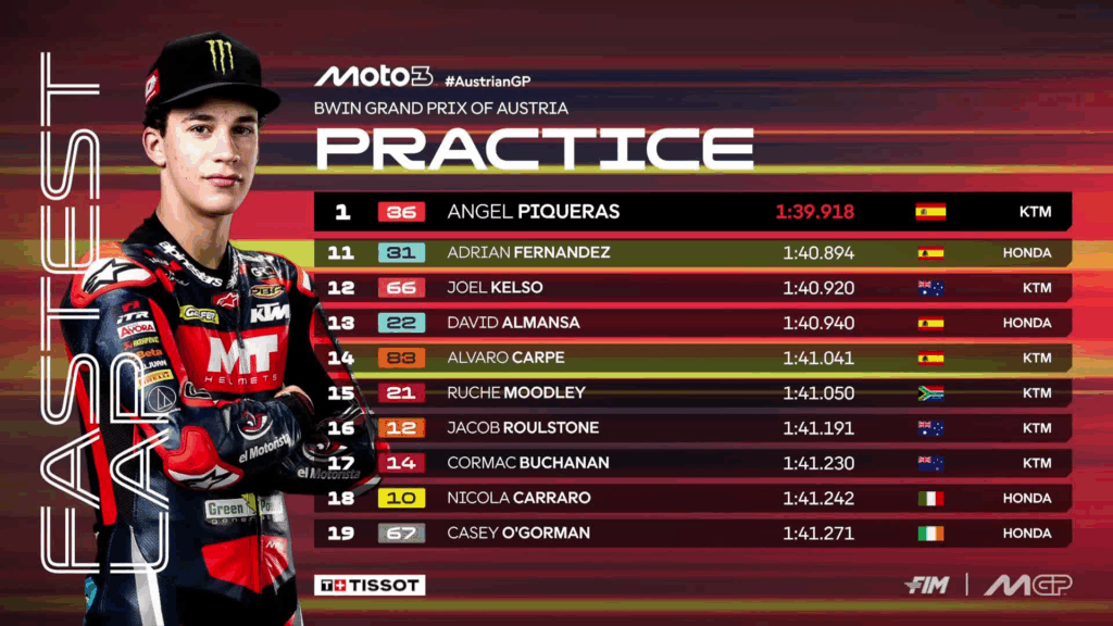 Il motomondiale non si ferma nemmeno a Ferragosto: la categoria cadetta torna in pista per decretare i 14 piloti che partiranno direttamente dal Q2. A firmare il giro più veloce al Red Bull Ring è la KTM di Angel Piqueras; il giovane pilota spagnolo sembrerebbe aver ripreso la confidenza di inizio stagione.