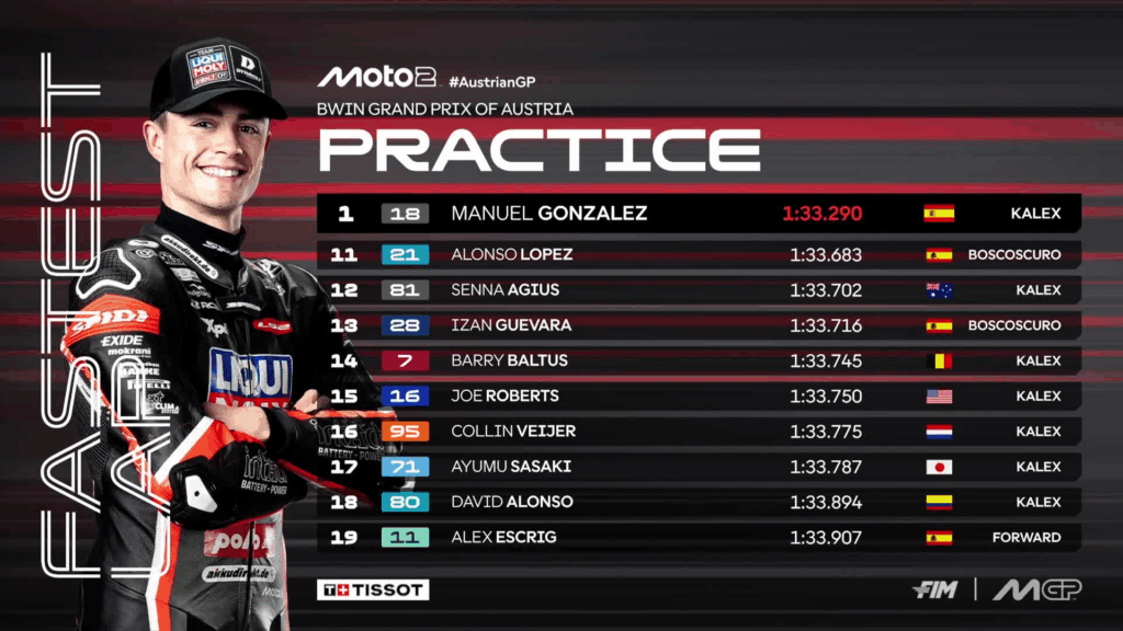 Subito dopo la Moto3 si riaccendono i motori al Red Bull Ring: è ora il turno della categoria intermedia, dove ventinove piloti si sfidano per soli 14 ingressi diretti al Q2 di domani. Turno di pre-qualifica combattutissimo, ma a far segnare il giro più veloce è sempre lui: Manu Gonzalez, che in 1:33.290 stabilisce un nuovo record della pista.