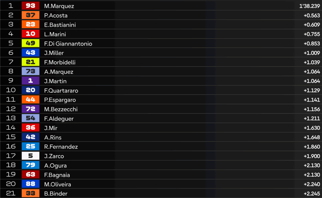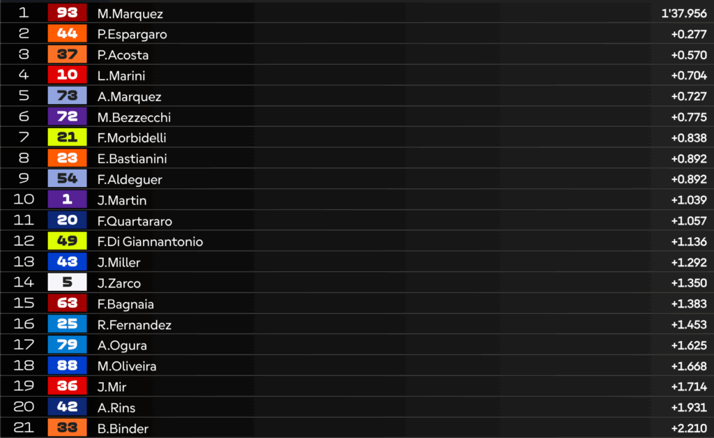 11:20 – Sesto tempo per Jorge Martin: ottima risalita per lo spagnolo.