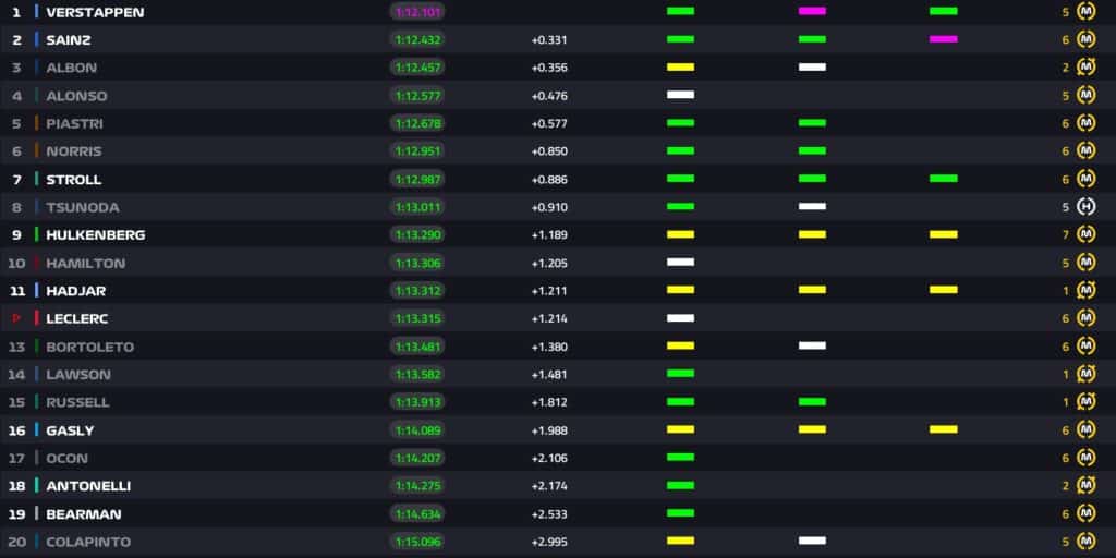 12:36 – Piastri detta il passo con un 1:12.678. Tutti i piloti in pista con gomma media, eccetto Yuki Tsunoda che monta mescola hard.