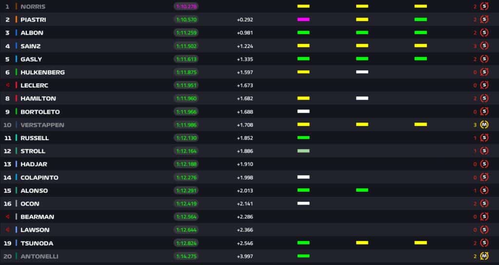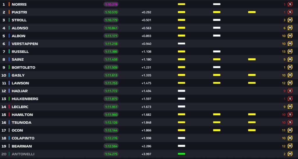 13:24 – Simulazione passo gara con mescola media per i piloti in pista. Norris monta una gomma vecchia 12 giri, Piastri e Russell di 11 giri.