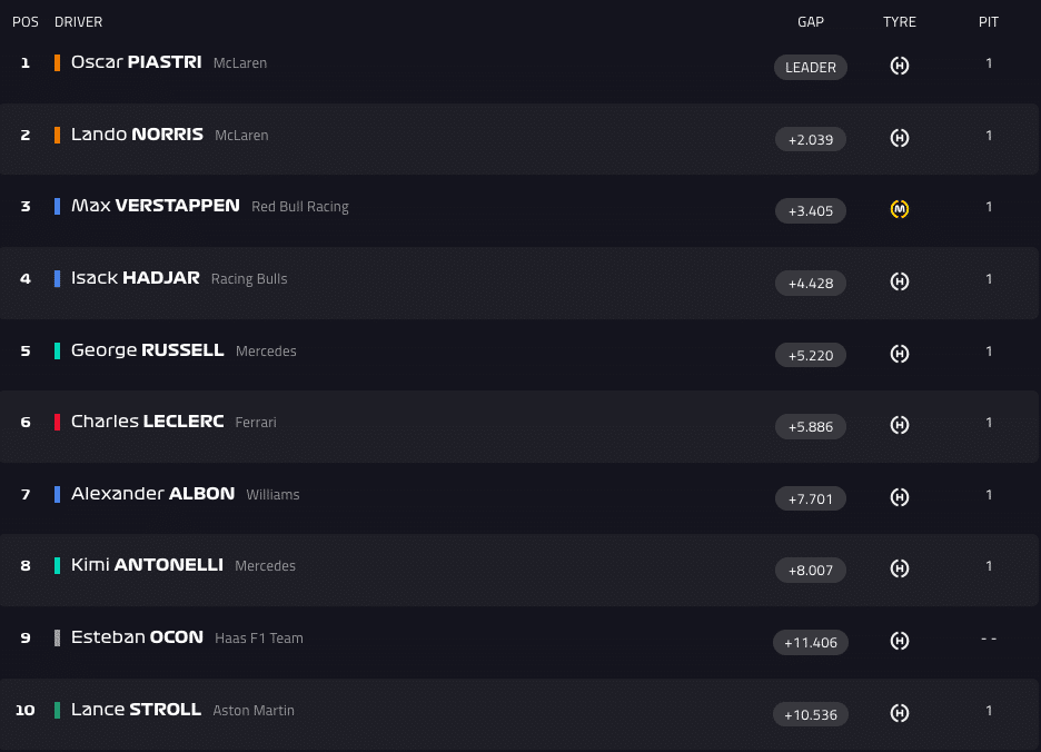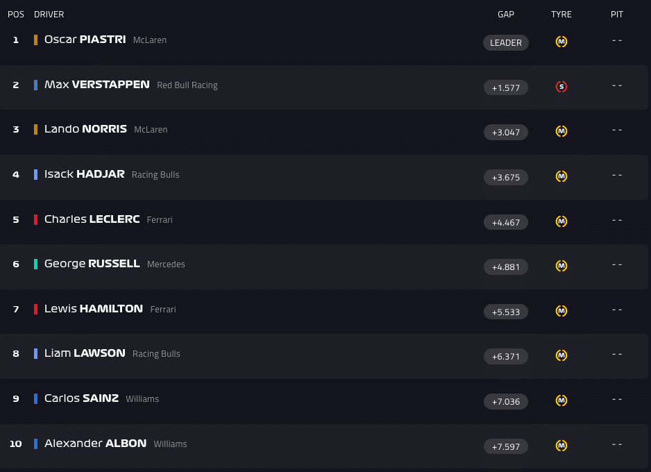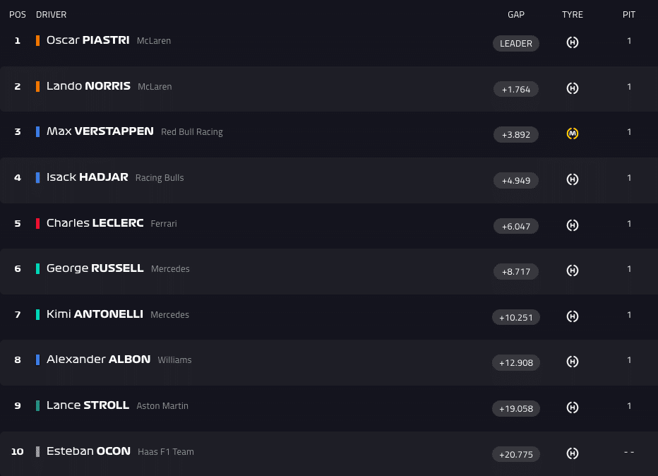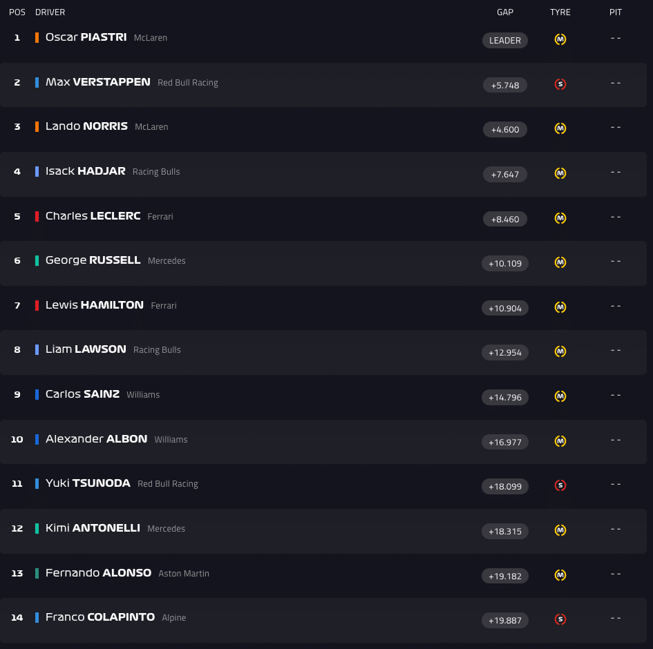 GIRO 13 – L’ordine al giro 13. Errore nel live timing della F1: in realtà l’ordine è Piastri, Norris (+3.0), Verstappen (+7.6).
