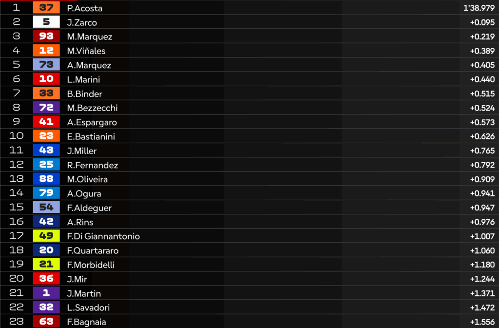 In quarta posizione si rivede Maverick Viñales, al rientro dopo l’infortunio, davanti ad Álex Márquez, Luca Marini, Brad Binder, Marco Bezzecchi, e Aleix Espargaró (wild card Honda solo per questo GP). Chiude la top 10 Enea Bastianini, a +0.626.