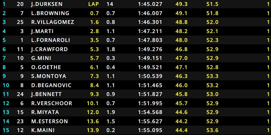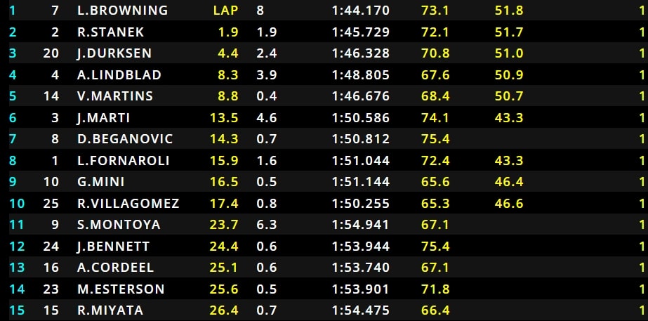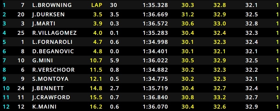 10:29 – Luke Browning diventa il nuovo leader della gara dopo aver passato Joshua Durksen.