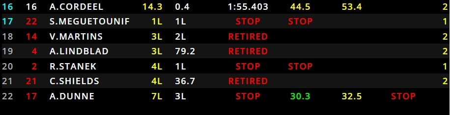 10:12 – Clamoroso bloccaggio di Lindblad che alla staccata della prima variante silura Roman Stanek. Altra SAFETY CAR.