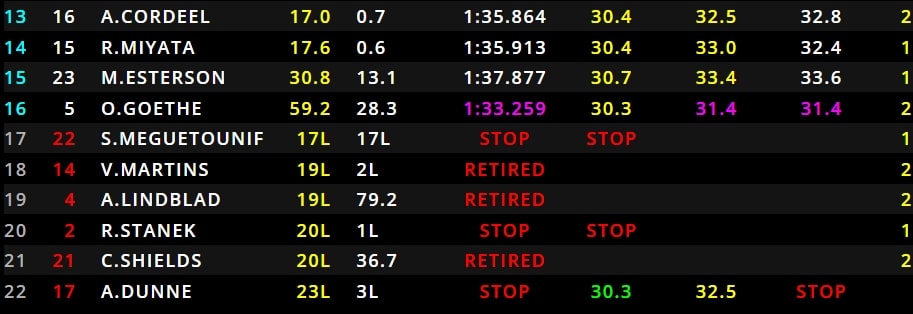 10:04 – Goethe è rientrato ai box per il pitstop, lasciando provvisoriamente la leadership a Browning.