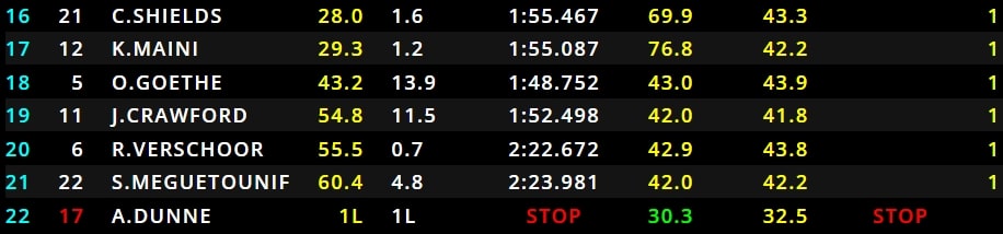 09:58 – Luke Browning viene superato da Goethe che si prende la prima posizione dopo aver fatto registrare il giro più veloce.