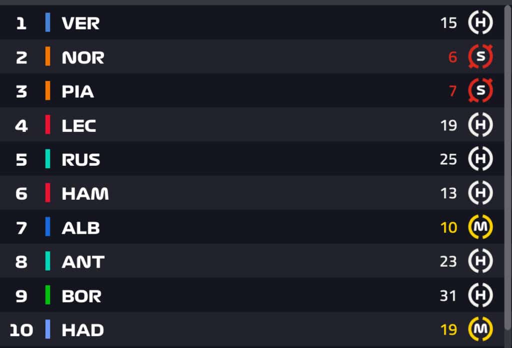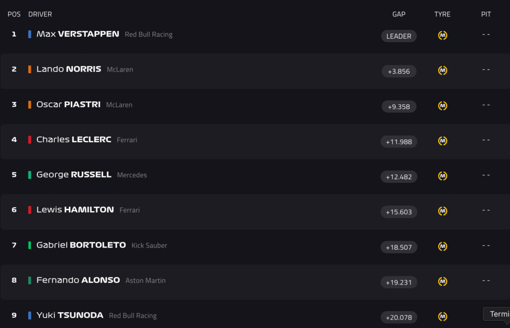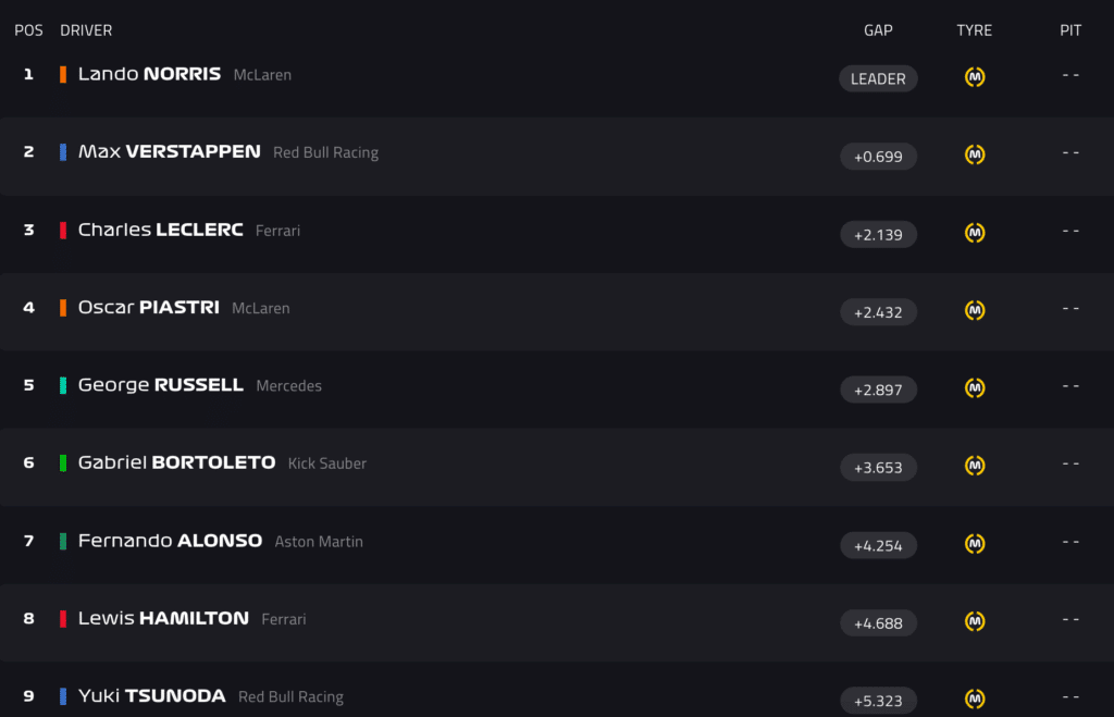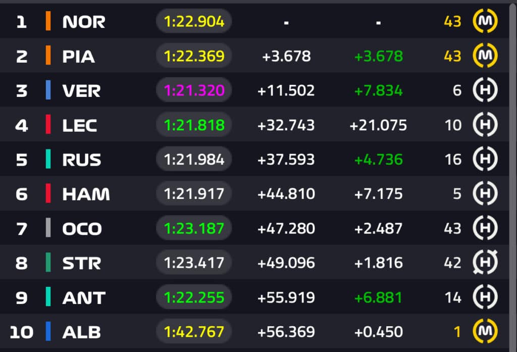 Giro 40 – Le posizioni attuali: Norris, Piastri, Verstappen (fermatosi lo scorso giro), Albon, Leclerc, Russell. 9° Hamilton.