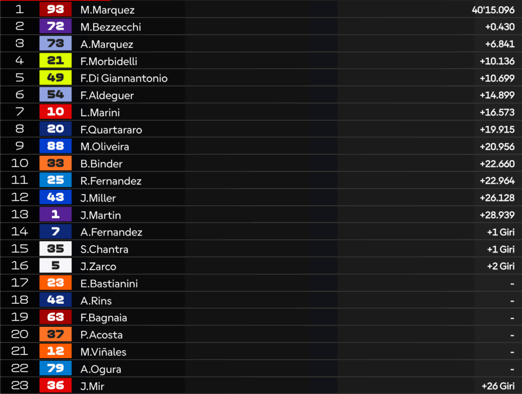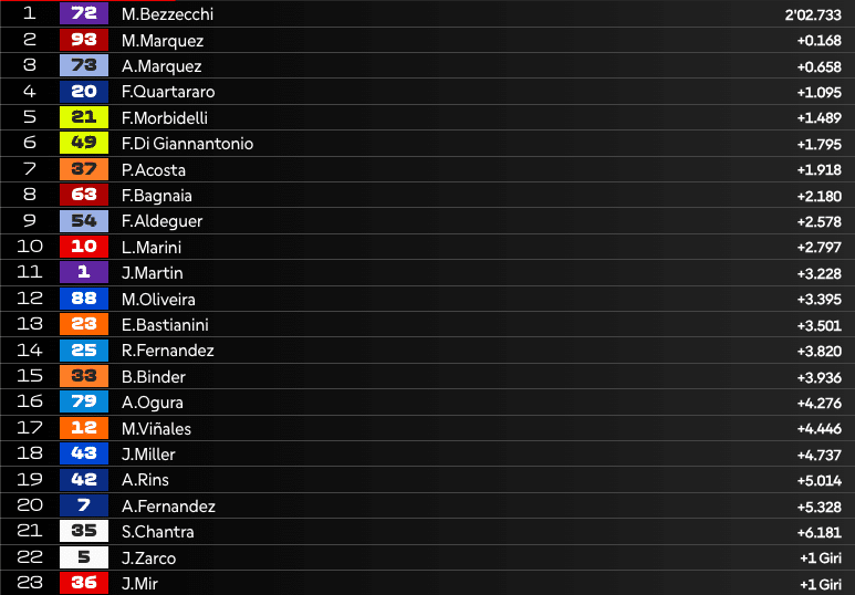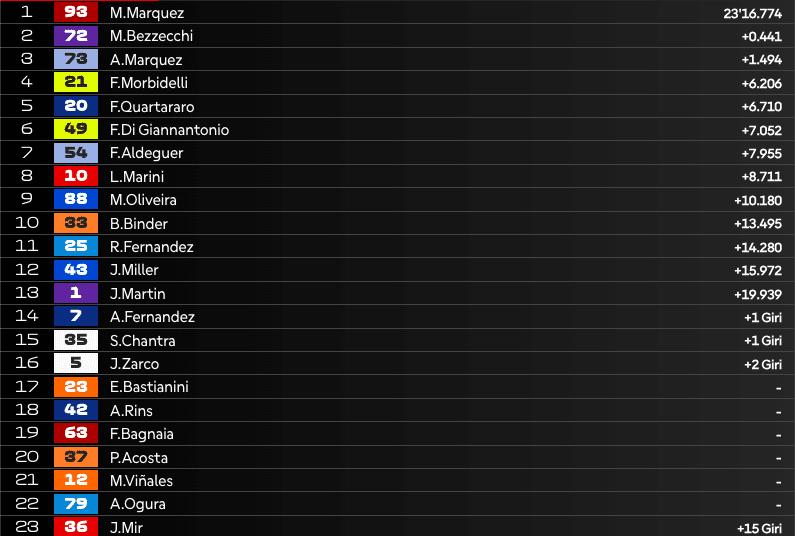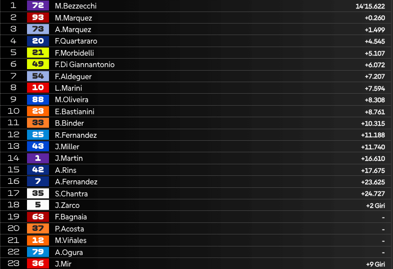 14:03 – VIA! Bezzecchi tiene il 1° posto, Marc Marquez scavalca Alex ed è 2°.