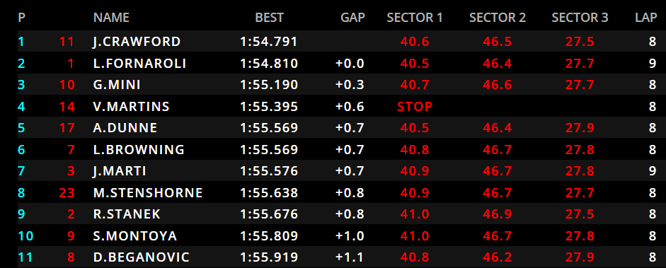 12:28 – The first runs for all drivers come to an end! In first place is Jak Crawford, who edged out Minì and Fornaroli by four-tenths, with the two Italians separated by just one thousandth. A big scare for the Championship leader, who kissed the wall with his right rear exiting Turn 15.