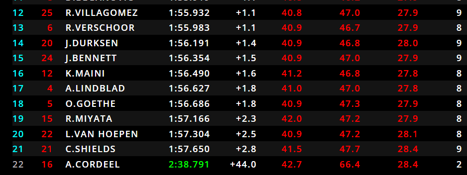 12:11 – The first to cross the line is Crawford, setting a 1:56.1. However, the time is beaten by Stanek by two-tenths, immediately followed by Minì.