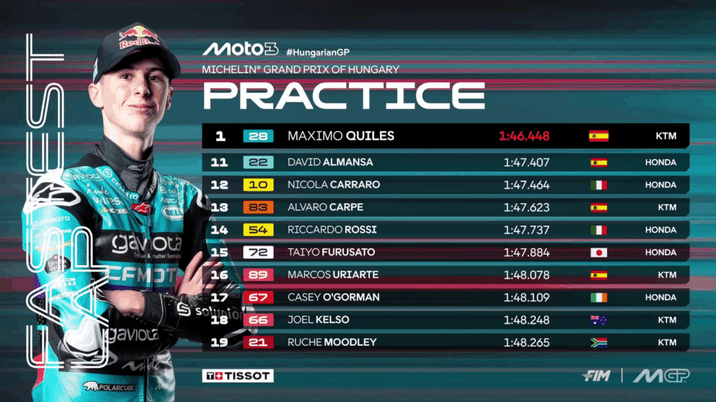 The lightweight class of the world championship returns to the track for the second and final session of Friday: in just 35 minutes, the fate of tomorrow’s qualifying is decided. Let’s take a look at the 14 riders who go directly through to Q2 — a solid advantage, considering that everyone at Balaton is racing on equal footing.