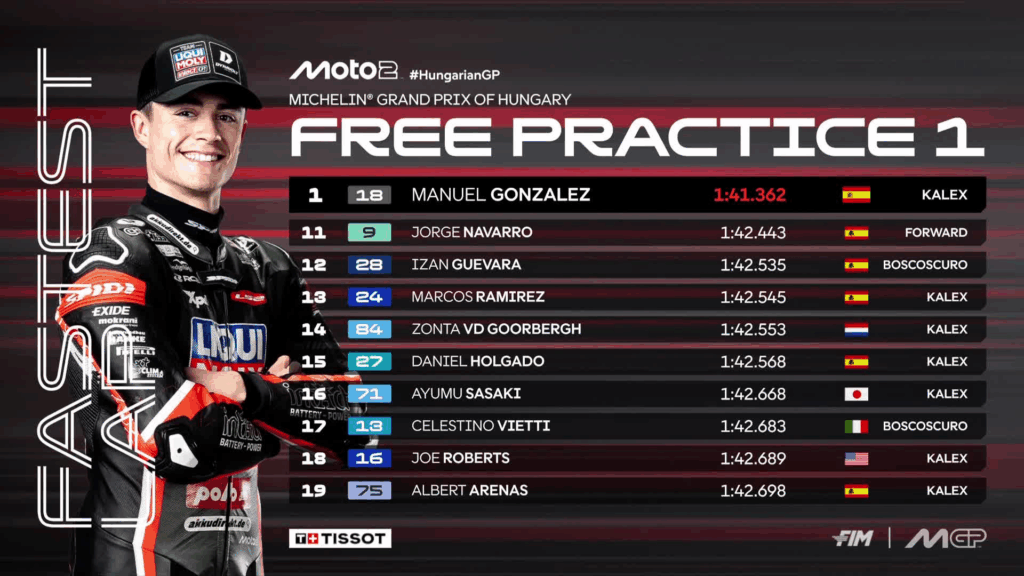 After Moto3, the intermediate class also begins to get to grips with the new circuit. Amid numerous yellow flags and crashes, Manu Gonzalez continues to shine. Rider #18 leads once again, this time in Hungary.