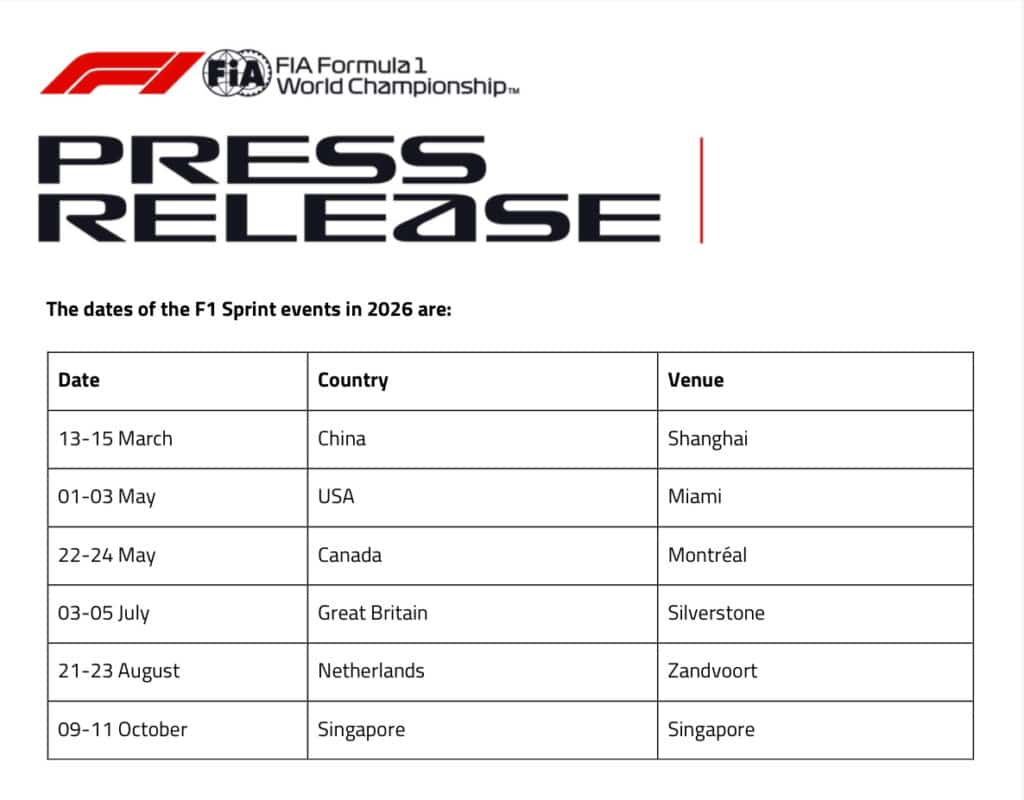 Ya no hay dudas: la Fórmula 1 ha publicado el calendario oficial de las seis Sprint de 2026